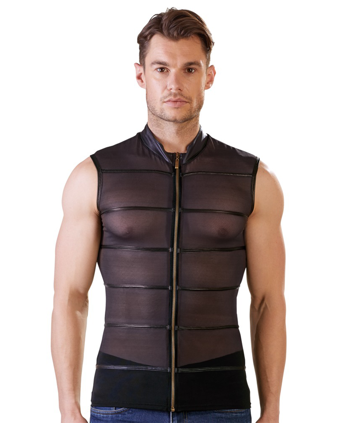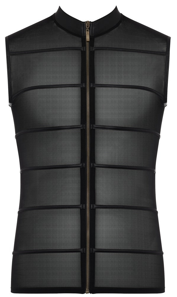 Zeigen Sie Ihre Muskeln – dieses ärmellose schwarze Powernet-Shirt rückt sie in den Mittelpunkt. Das transparente Material wird durch matte schwarze Streifen aufgelockert, die dem Shirt eine besondere Note verleihen. Das dehnbare Shirt mit hohem Kragen hat einen kleinen Stehkragen und lässt sich dank des durchgehenden Reißverschlusses vorne blitzschnell öffnen.